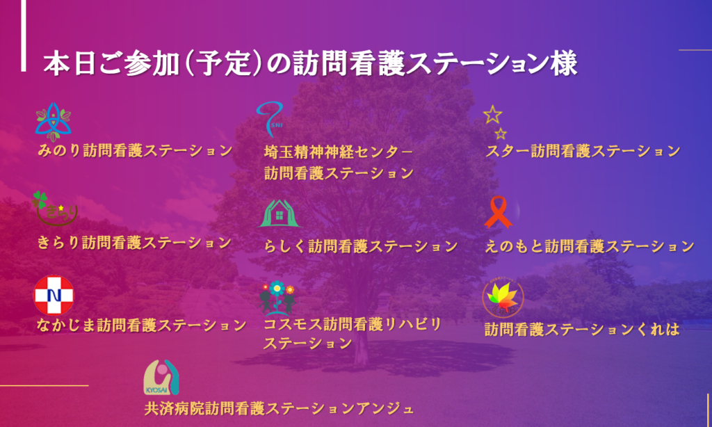 ご参加(予定含む)していただきました訪問看護ステーションの皆様を勝手ながら紹介させていただきました。